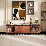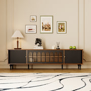 80.73''French Style TV Cabinet Two-Tone Finish Curved Glass Doors High-Leg Frame Dual Drawer Storage
