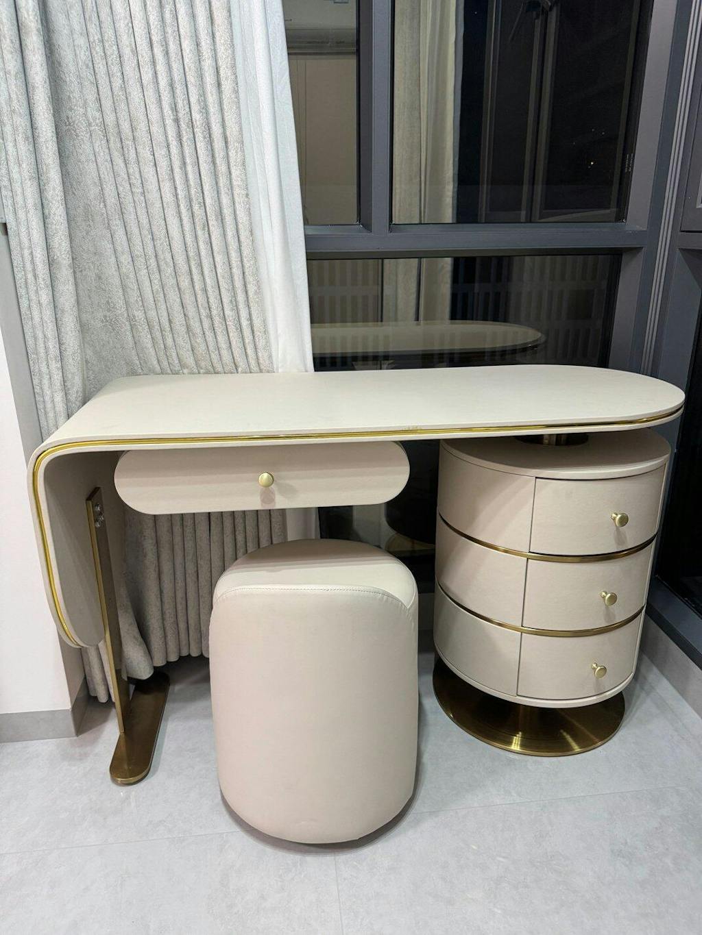 This modern luxury vanity desk features a soft cream finish paired with elegant gold accents, creating a refined and feminine aesthetic. Equipped with a spacious drawer and a multi-tier side cabinet, it offers practical storage for cosmetics and daily essentials. The matching upholstered stool completes the set, making it perfect for bedrooms, dressing areas, or stylish apartments seeking both function and elegance.
