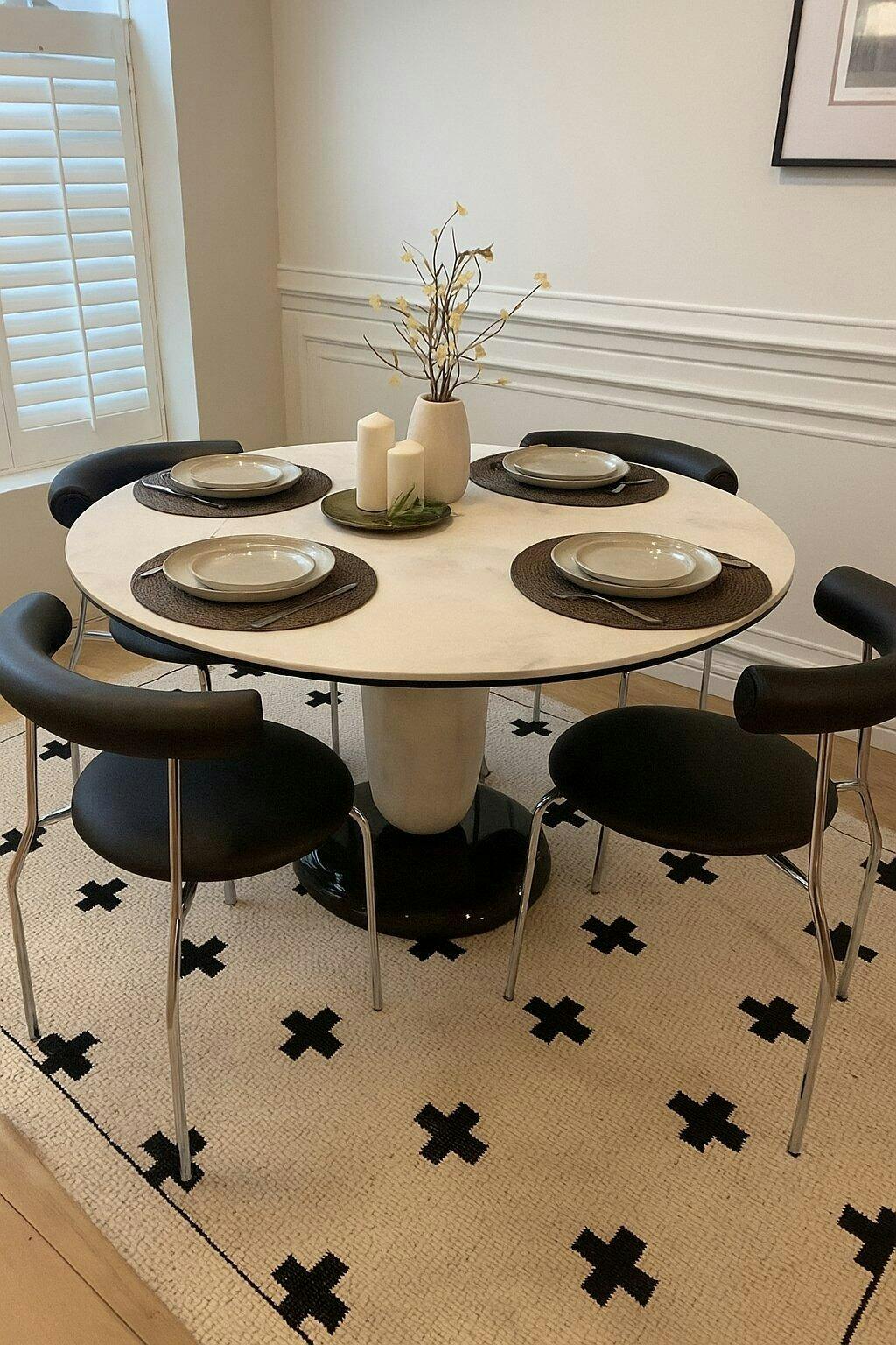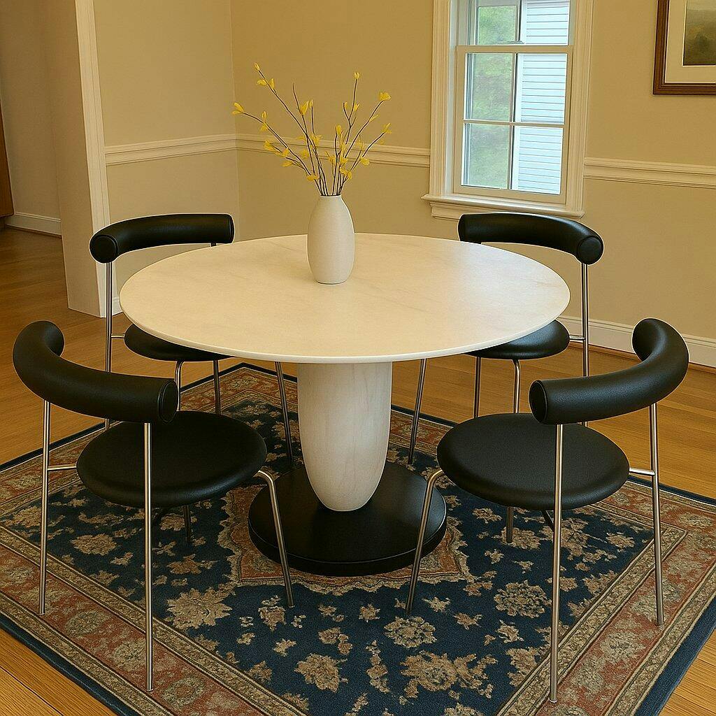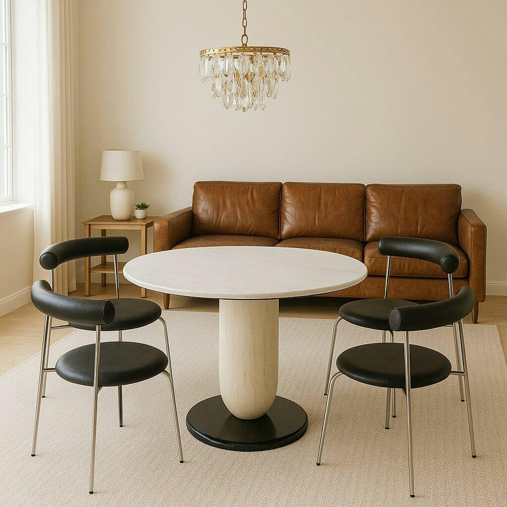 - Sleek and Elegant Design: A minimalist round dining table with a sophisticated marble top and bold, artistic base.