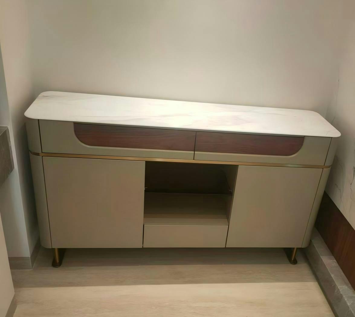 This modern luxury sideboard cabinet combines refined aesthetics with practical storage solutions. Featuring a sleek marble-look tabletop, soft neutral finishes, and warm wood-accent drawers, it creates a harmonious balance between elegance and functionality. The open central display shelves with integrated lighting add depth and visual interest, making it ideal for showcasing glassware or decorative pieces. Slim metal legs elevate the design, giving the cabinet a light, sophisticated presence suitable for contemporary dining and living spaces.