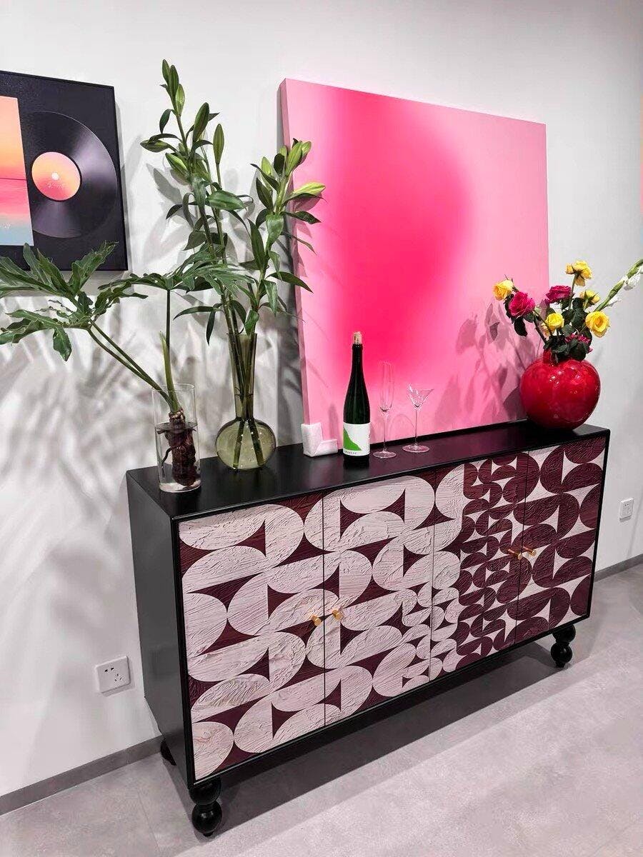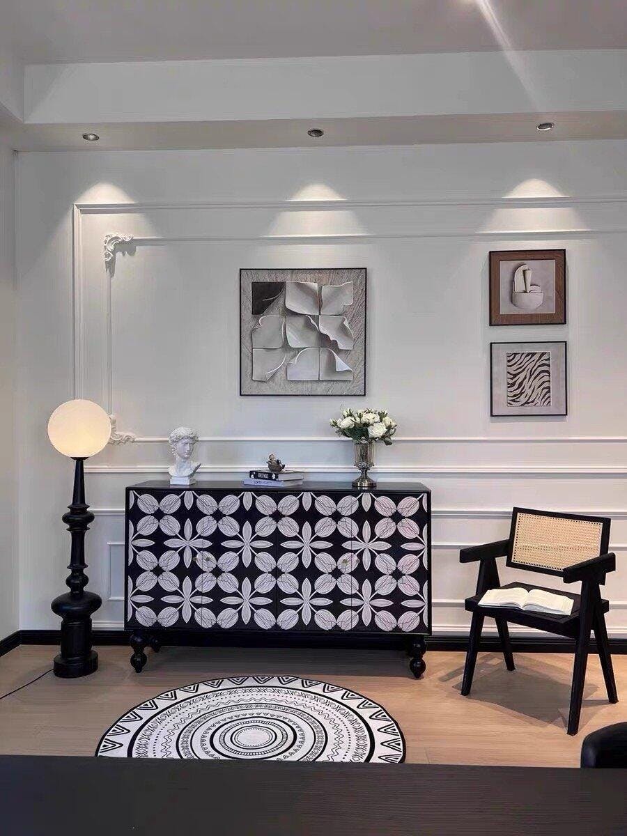 This vintage hand-painted sideboard adds a striking artistic presence to any dining or living space. Featuring an eye-catching geometric pattern in bold black and cream tones, it blends retro charm with contemporary flair. The cabinet stands on uniquely carved legs that enhance its classic character, while the smooth painted finish brings sophistication and style. Perfect for those who appreciate statement furniture, this sideboard provides both visual impact and practical storage for tableware, décor, or daily essentials.