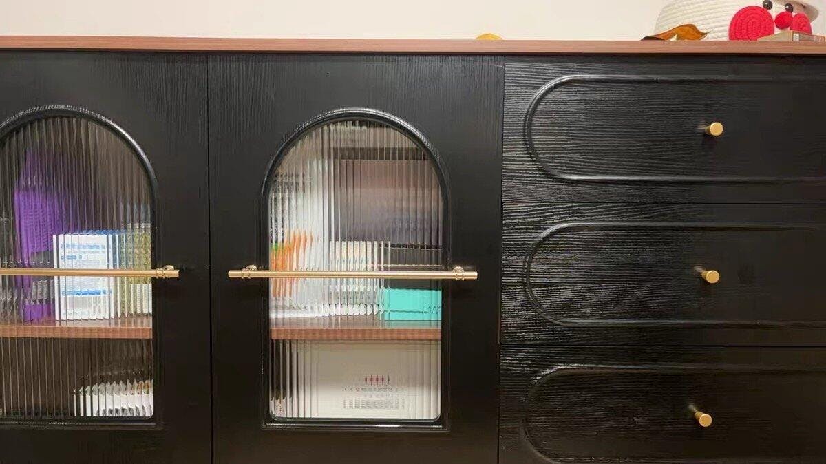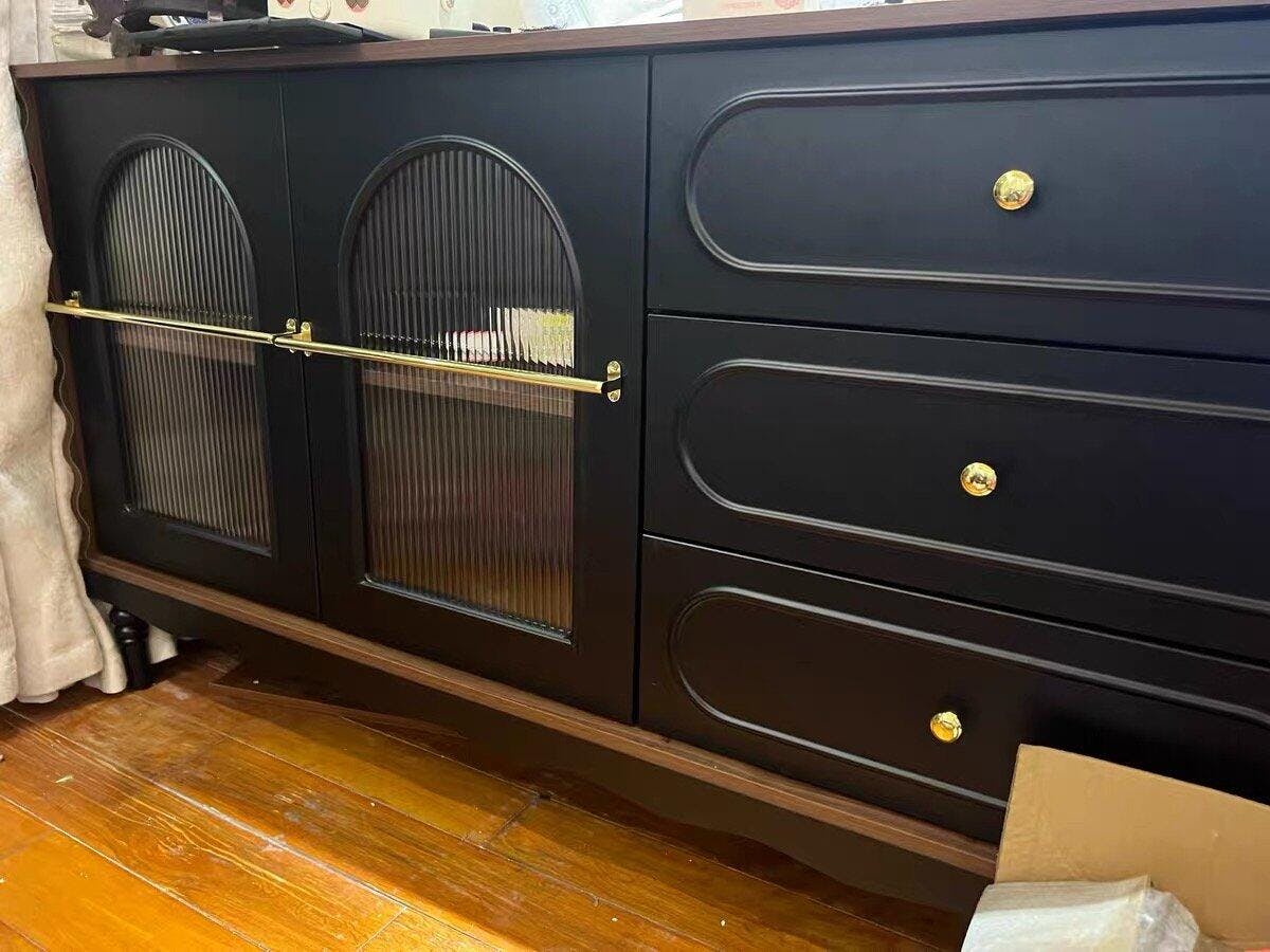 This vintage-style black sideboard combines timeless elegance with practical storage. The beautifully arched fluted glass doors showcase your tableware or décor while keeping them protected from dust. Gold-tone hardware adds a refined touch that enhances the cabinet’s retro charm.