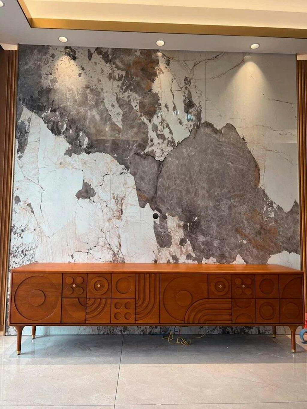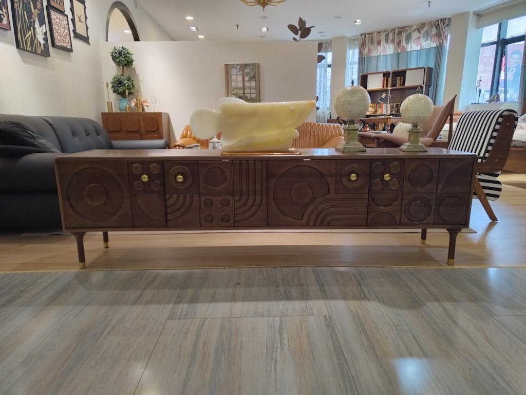 Bold retro flair meets artisan craftsmanship in this 78" solid wood TV stand. Intricately carved geometric patterns across the front offer a sculptural and artistic presence. Ideal for vintage-inspired living rooms, it doubles as a TV unit and statement piece, with ample hidden storage for electronics and essentials.