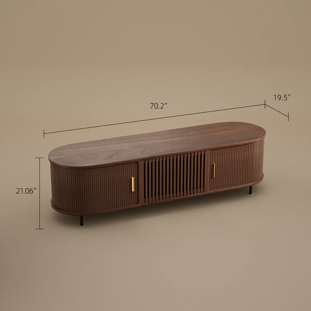 - High-end material & craftsmanship – The TV stand’s walnut veneer with ribbed vertical texture and refined metal handles brings tactile richness and visual depth.