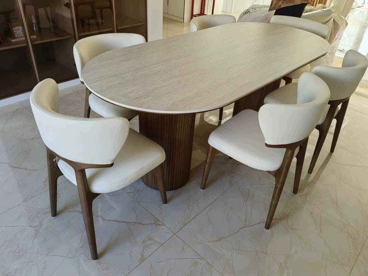 This modern travertine dining table embodies harmony between nature and craftsmanship. The beautifully polished travertine tabletop offers both durability and sophistication, while the fluted solid wood pedestal legs add architectural charm and support. Designed to complement a wide range of home décor, it transforms any dining room into a welcoming, elegant space.