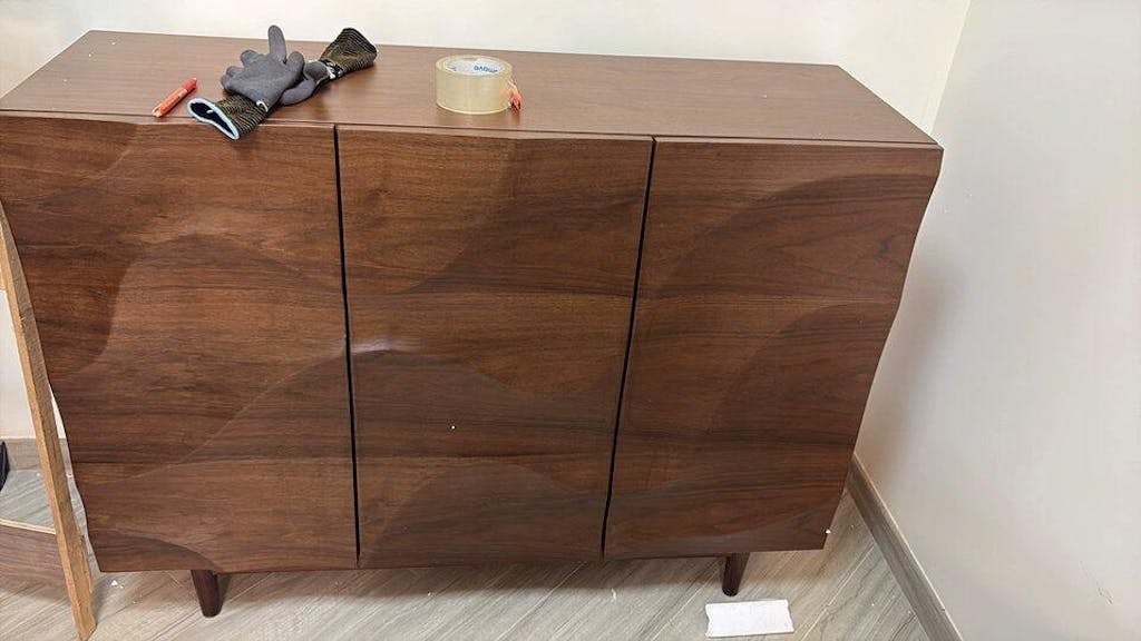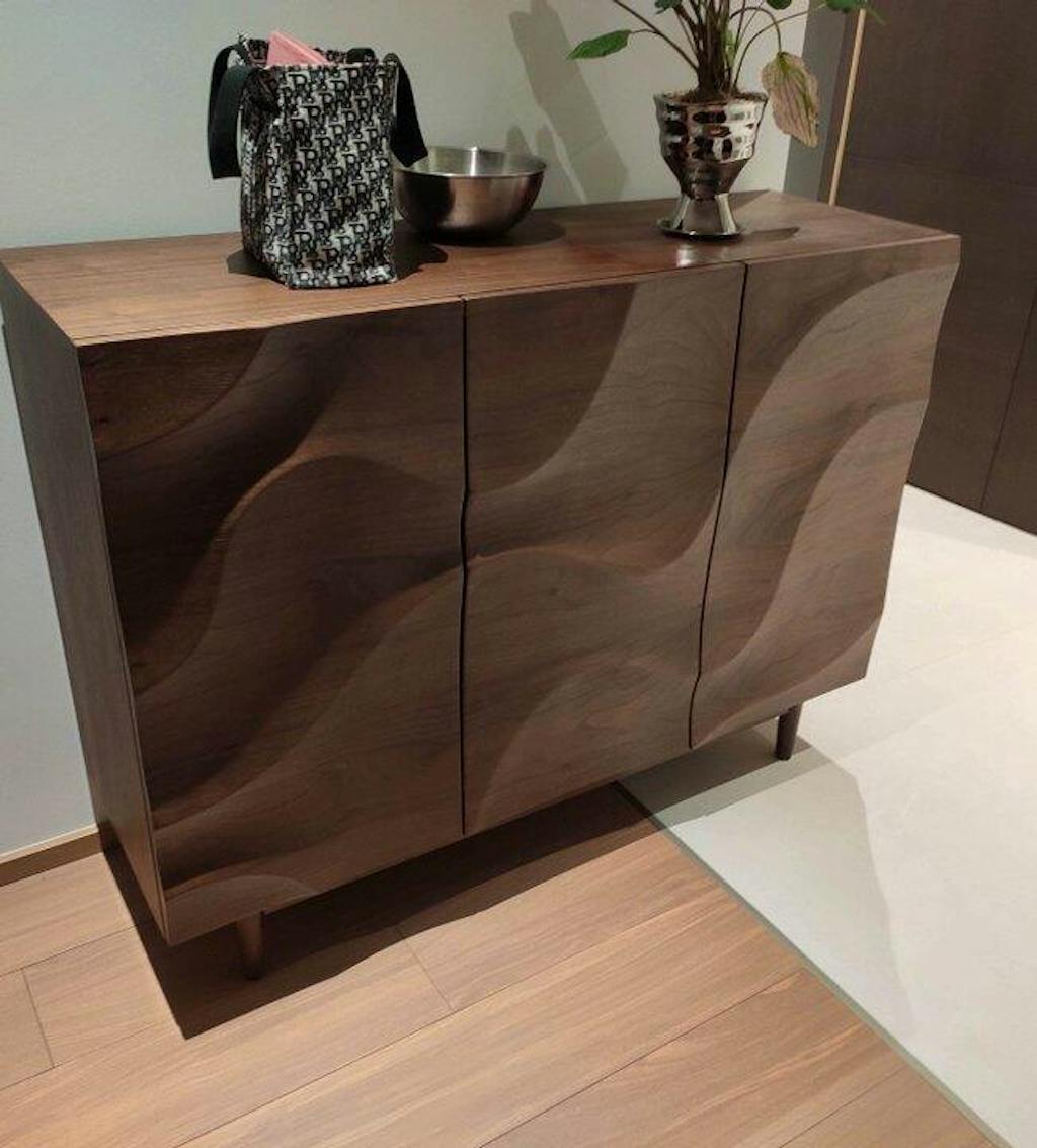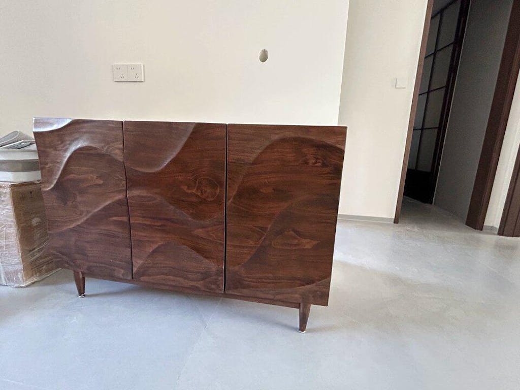 Modern 3-door sideboard cabinet offers both style and function. The irregular veneer pattern creates a unique artistic surface, while adjustable shelves provide flexible storage for tableware, drinks, or decorative pieces. With its warm wood tones and sleek lines, the cabinet adds a touch of contemporary charm to dining rooms, living rooms, or entryways. Ideal for those seeking a blend of practicality and modern aesthetics, it enhances the home environment with elegance and versatile organization.