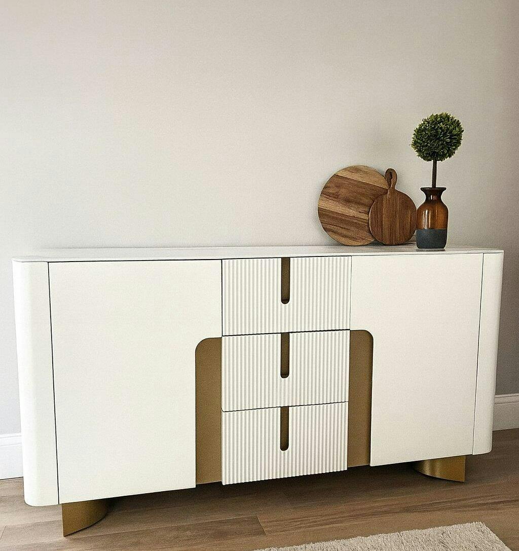 Modern sideboard combines minimalist design with practical storage. Featuring ribbed drawers, golden base, and a marble top, it creates a luxurious yet functional centerpiece for the living or dining room. Spacious drawers and side compartments provide organized storage for tableware, appliances, or daily essentials. Perfect for modern interiors, the cabinet blends style with utility, elevating the home with elegance and convenience.